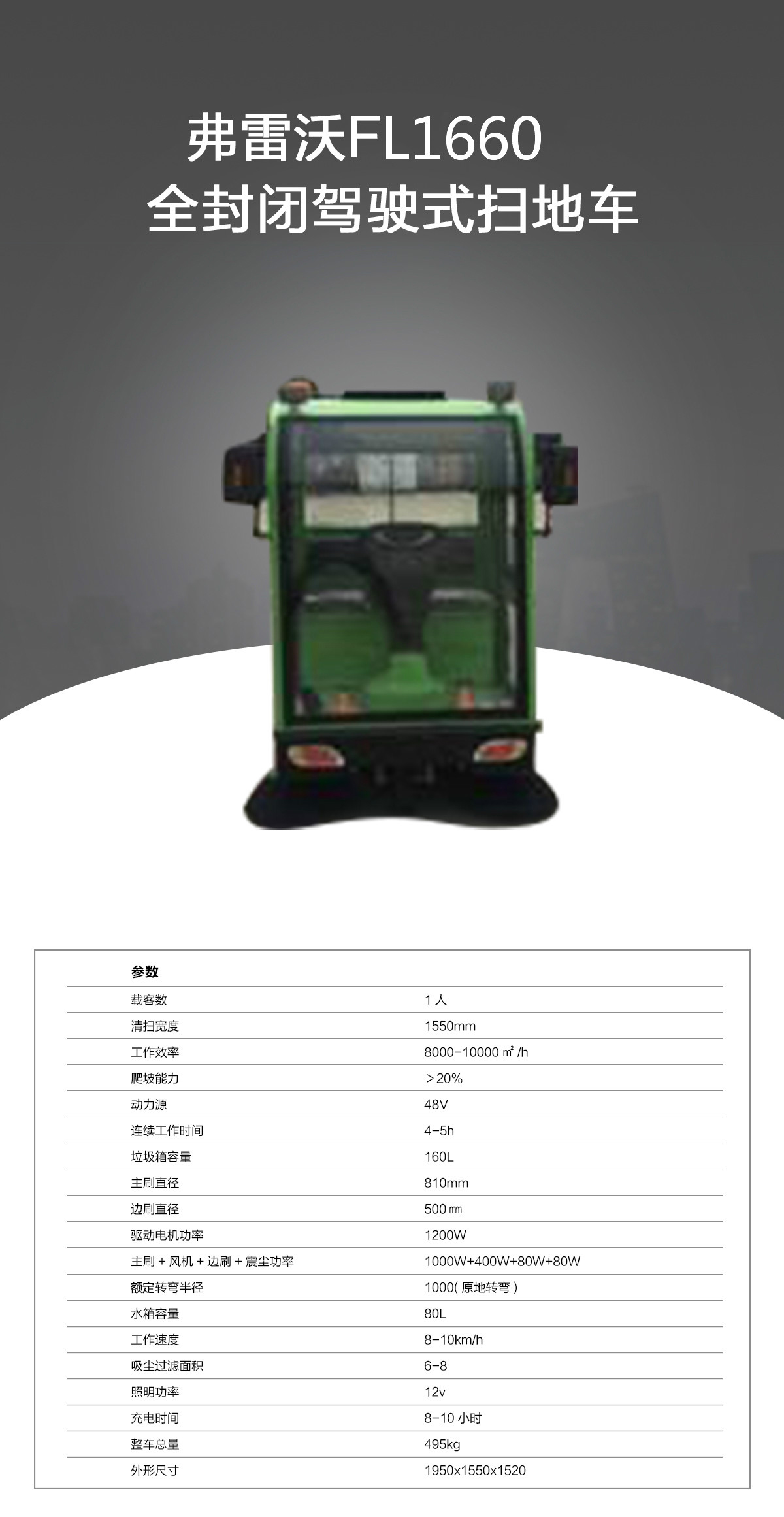 產(chǎn)品分類:駕駛式掃地機(jī)產(chǎn)品特點(diǎn):1、全封閉駕駛式掃地機(jī)1660特有出口型免維護(hù)電瓶,區(qū)別于市面上其他電動(dòng)掃地機(jī),其智能型充電機(jī)能有效延長(zhǎng)電瓶使用壽命,可使連續(xù)工作時(shí)間更長(zhǎng)。2、全封閉設(shè)計(jì)保護(hù)工作人員身心健康。3、底部主刷和兩側(cè)邊刷可自由調(diào)節(jié)高度使清掃效率更高,清掃寬度達(dá)到1550mm,完成1000㎡的地面清掃工作僅需6分鐘,比傳統(tǒng)人力清掃效率提高幾十倍,并且還能節(jié)省人力成本,省時(shí)省力、更省錢!4、控制面板友好,操作簡(jiǎn)單、易懂,使用前工作人員無(wú)需特別培訓(xùn),“保潔大媽也能輕松操作完成清掃任務(wù)”。5、配備的優(yōu)良吸塵系統(tǒng)能夠有效抑制揚(yáng)塵的產(chǎn)生,避免二次污染。適用環(huán)境:車站、機(jī)場(chǎng)、物業(yè)小區(qū)、倉(cāng)庫(kù)、車間、園區(qū)、廣場(chǎng)、學(xué)校、醫(yī)院、商場(chǎng)、公園、市政單位、街道等公共場(chǎng)所地面。